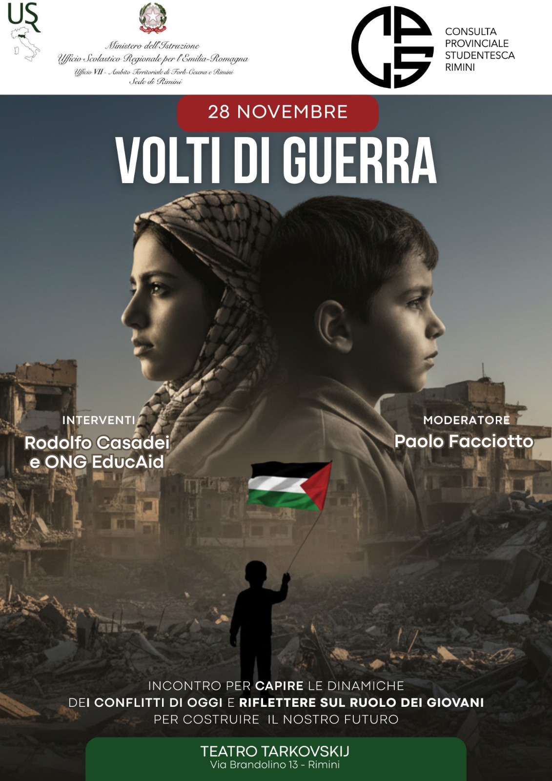 La Consulta Provinciale Studentesca di Rimini organizza, per le classi del triennio delle scuole secondarie di secondo grado, un Convegno dal titolo “VOLTI DI GUERRA”, che si terrà in data 28 novembre 2025 dalle ore 9.00 alle ore 12.00 circa, presso il Teatro Tarkovskij, in via Brandolino, 13 a Rimini. In allegato la locandina.