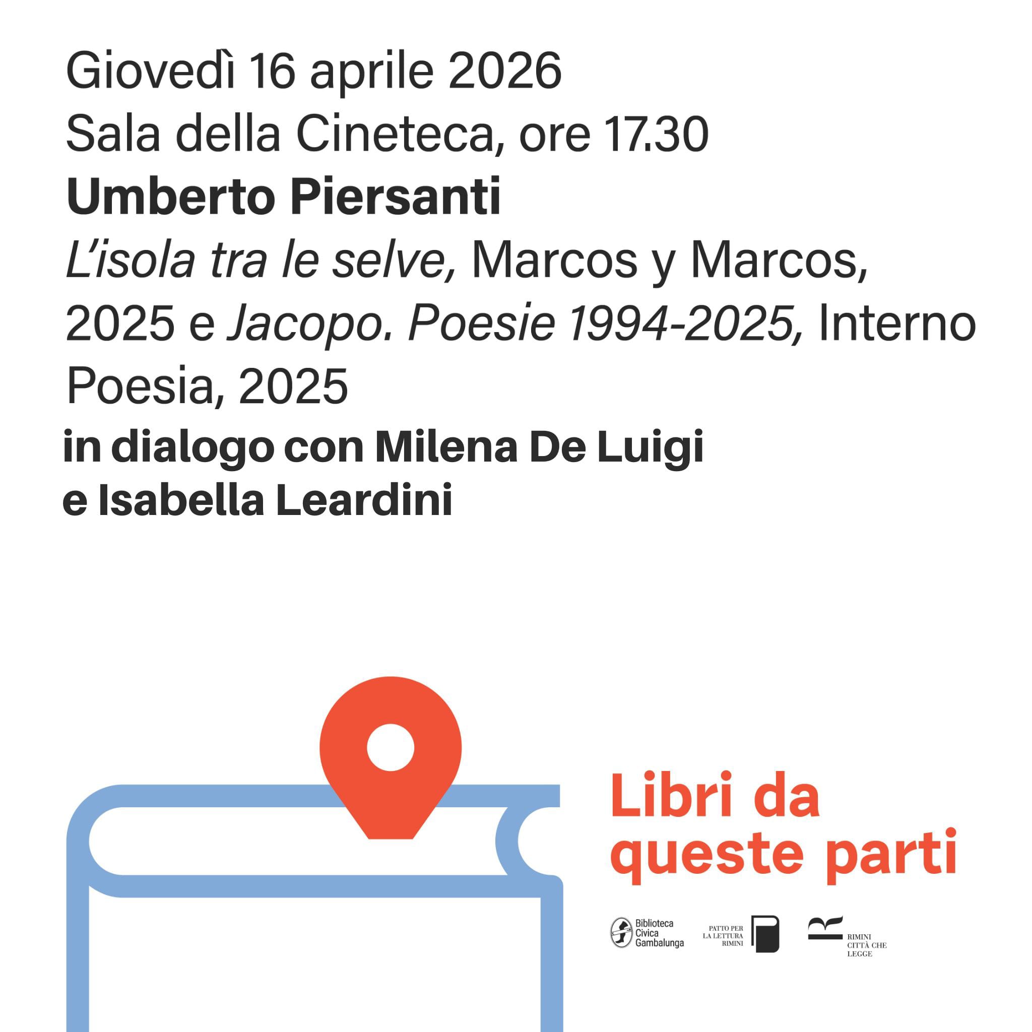 Nell’ambito della la rassegna “Libri da queste parti”, della Biblioteca civica Gambalunga di Rimini, nel mese di aprile la poesia troverà voce con Umberto Piersanti, protagonista di un incontro dedicato a L’isola tra le selve (Marcos y Marcos, 2025) e Jacopo. Poesie 1994-2025 (Interno Poesia, 2025): un attraversamento di oltre trent’anni di scrittura, tra paesaggio, memoria e radici, in un